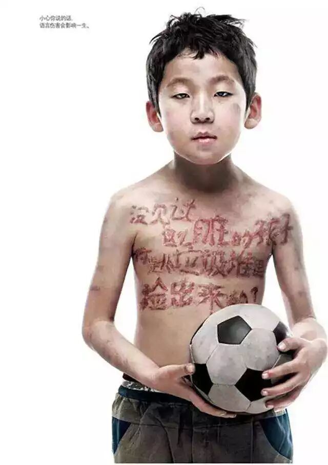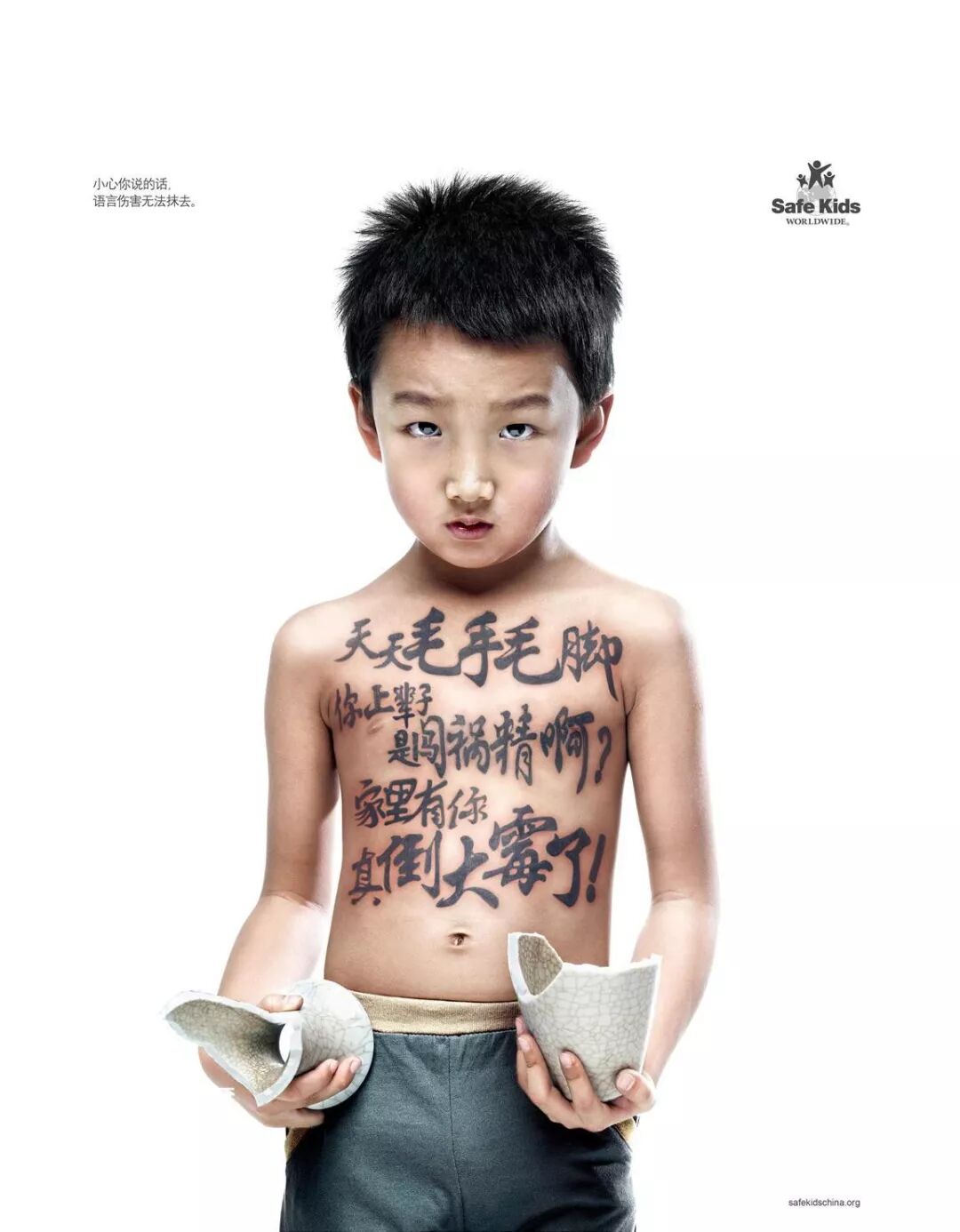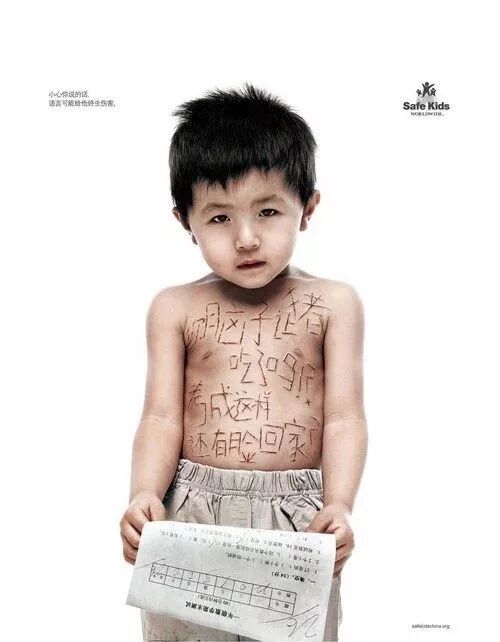 海报的制作人,把这些话刻在了孩子的身上,就像伤疤一样。